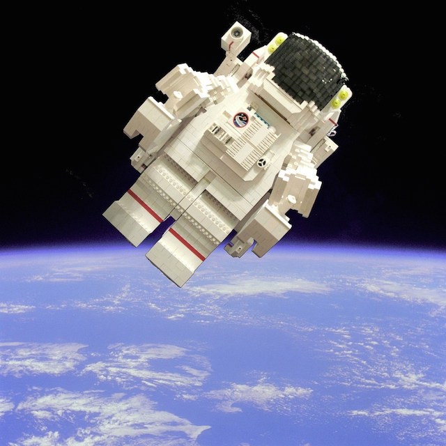 宇宙遊泳といえばこの写真。ブルース・マッカンドレスが命綱無しで行った宇宙遊泳の写真をLEGOで再現。