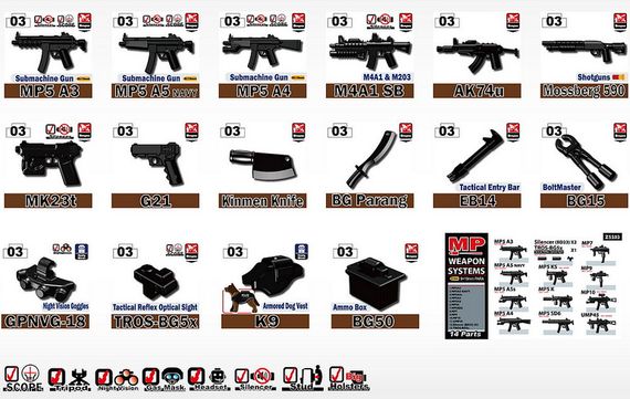 物騒ではございますが、ミニフィグサイズの小火器やナイフなどの武器がいろいろ。